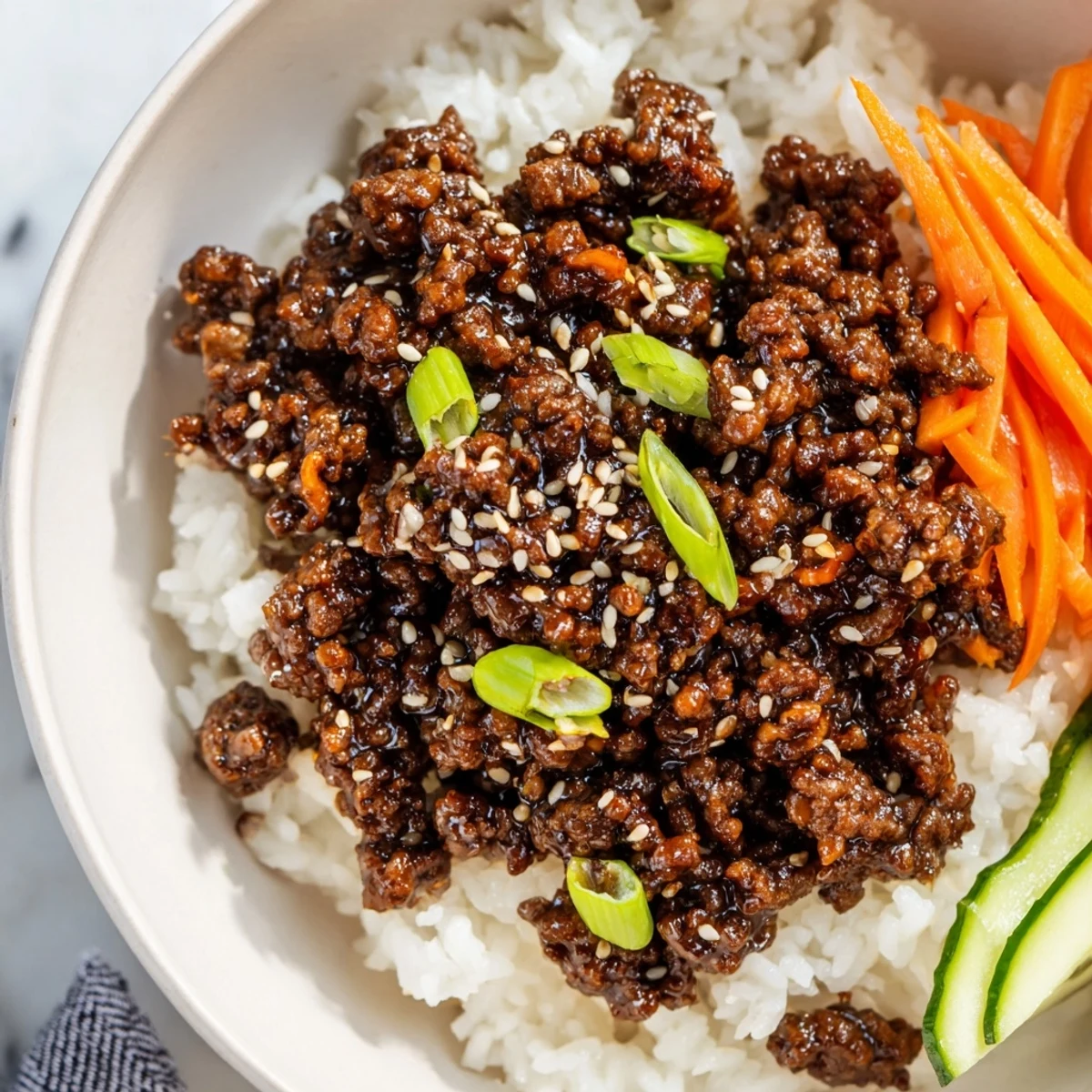 - Divide the fluffy rice among four bowls and top with generous portions of the saucy beef. Arrange the carrots, cucumber, scallions, and sesame seeds on top, then add kimchi or cilantro if you're feeling fancy.