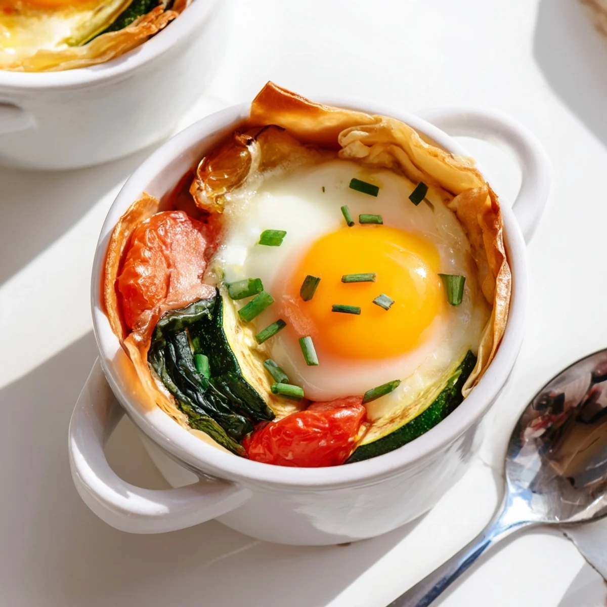 - Place one slice of puff pastry or brioche in the bottom of each ramekin, then layer on the wilted spinach, zucchini slices, tomato, and your ham or mushrooms