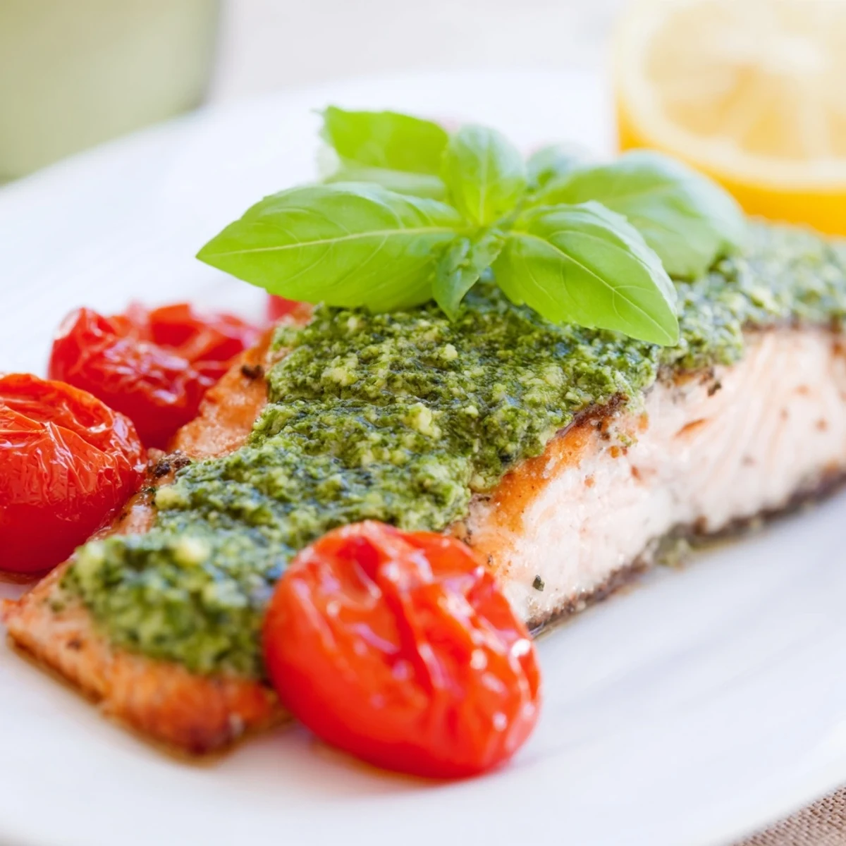 Since basil pesto can brown under direct heat, spread it on the salmon just before baking rather than beforehand. You can also cover the baking sheet loosely with foil for the first 10 minutes, then remove to allow the tomatoes to caramelize.