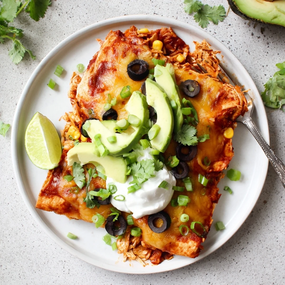 This comforting Tex-Mex casserole brings together layers of tender shredded chicken, black beans, corn, and flour tortillas, all smothered in a rich red enchilada sauce and topped with gooey melted cheese. The assembly comes together quickly in under 20 minutes, then bakes until the cheese is golden and bubbly. Customize with your favorite toppings like fresh cilantro, avocado, sour cream, and a squeeze of lime for a complete meal that serves six.