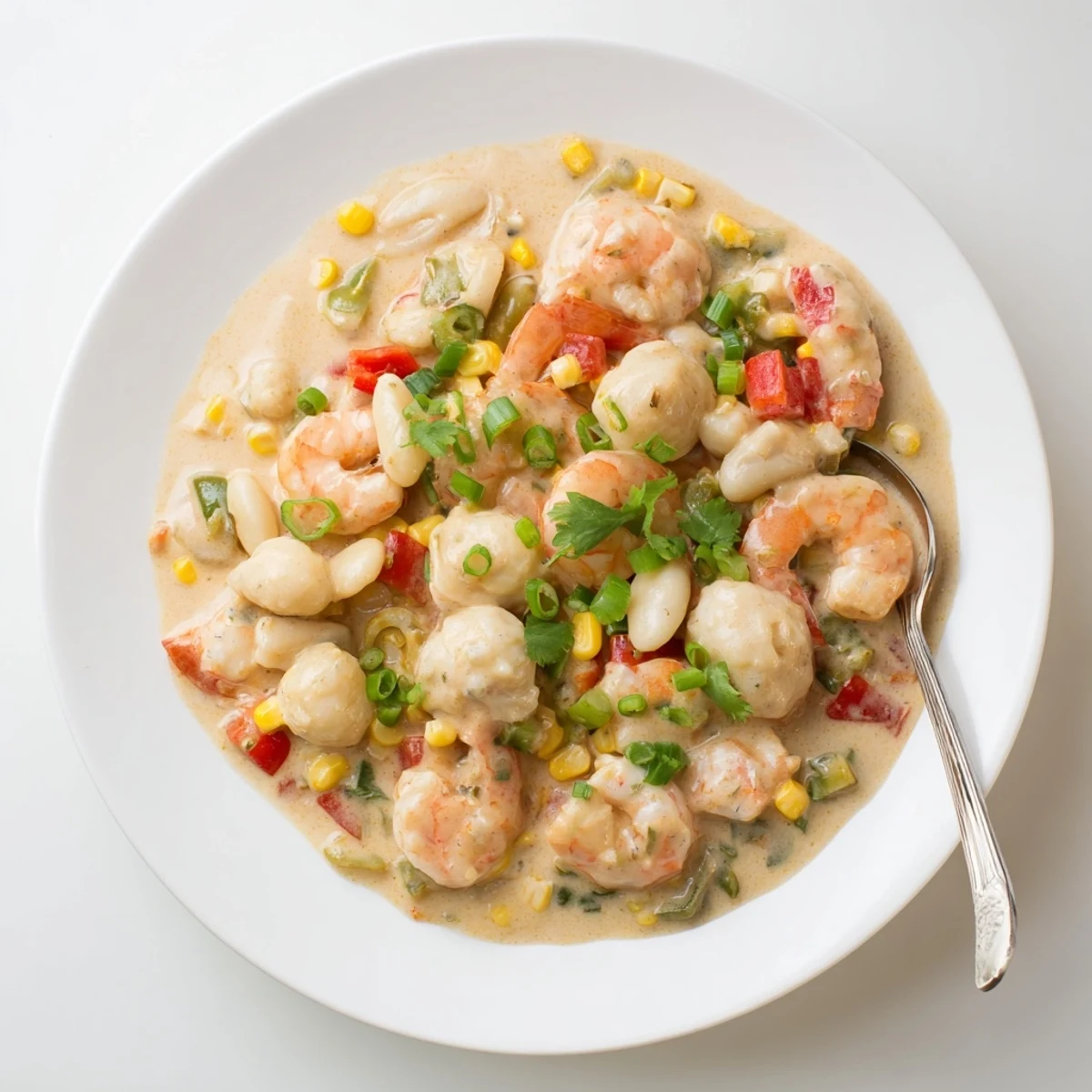 This hearty seafood stew combines tender shrimp with scallops, calamari, or firm white fish in a luxuriously creamy base. The mildly spiced sauce features aromatic vegetables, beans, and sweet corn, creating a comforting bowl that's ready in about an hour.