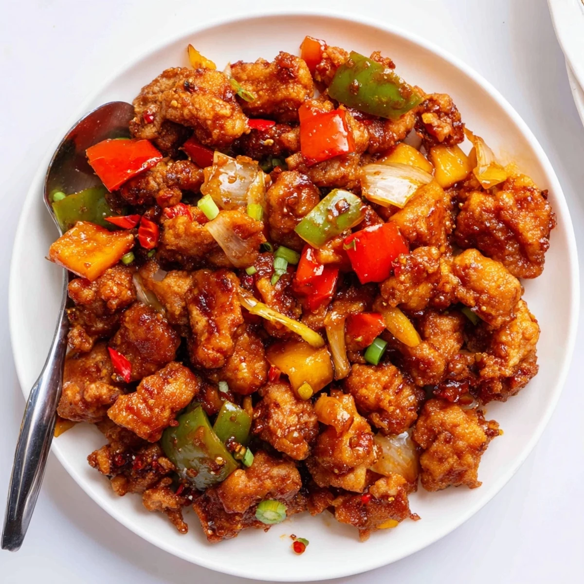 This Indo-Chinese favourite pairs crispy, cornflour-coated chicken with a bright, spicy-sweet chilli sauce and crunchy bell peppers and onions. Marinate briefly, deep-fry until golden, then stir-fry aromatics, combine with sauces and a cornflour slurry to glaze. Finish with spring onions and serve hot with fried rice or noodles for a satisfying, quick meal.