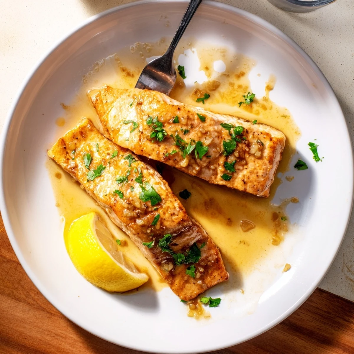 - Transfer salmon to plates, drizzle with any thickened glaze left in the pan, and sprinkle with fresh parsley and lemon wedges