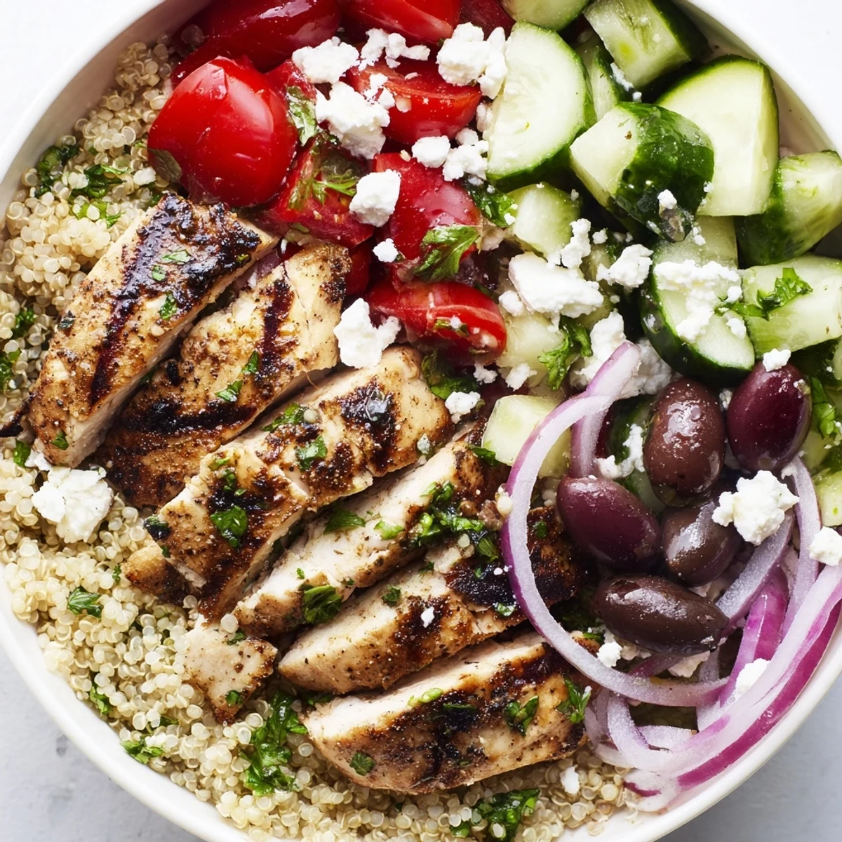 This vibrant bowl combines tender marinated grilled chicken breast with fluffy quinoa, creating a nutritious and satisfying meal. The dish features crisp cherry tomatoes, refreshing cucumber, tangy red onion, and briny Kalamata olives, all topped with creamy feta cheese and fresh parsley. A bright lemon-honey dressing ties everything together with zesty Mediterranean flavors.
