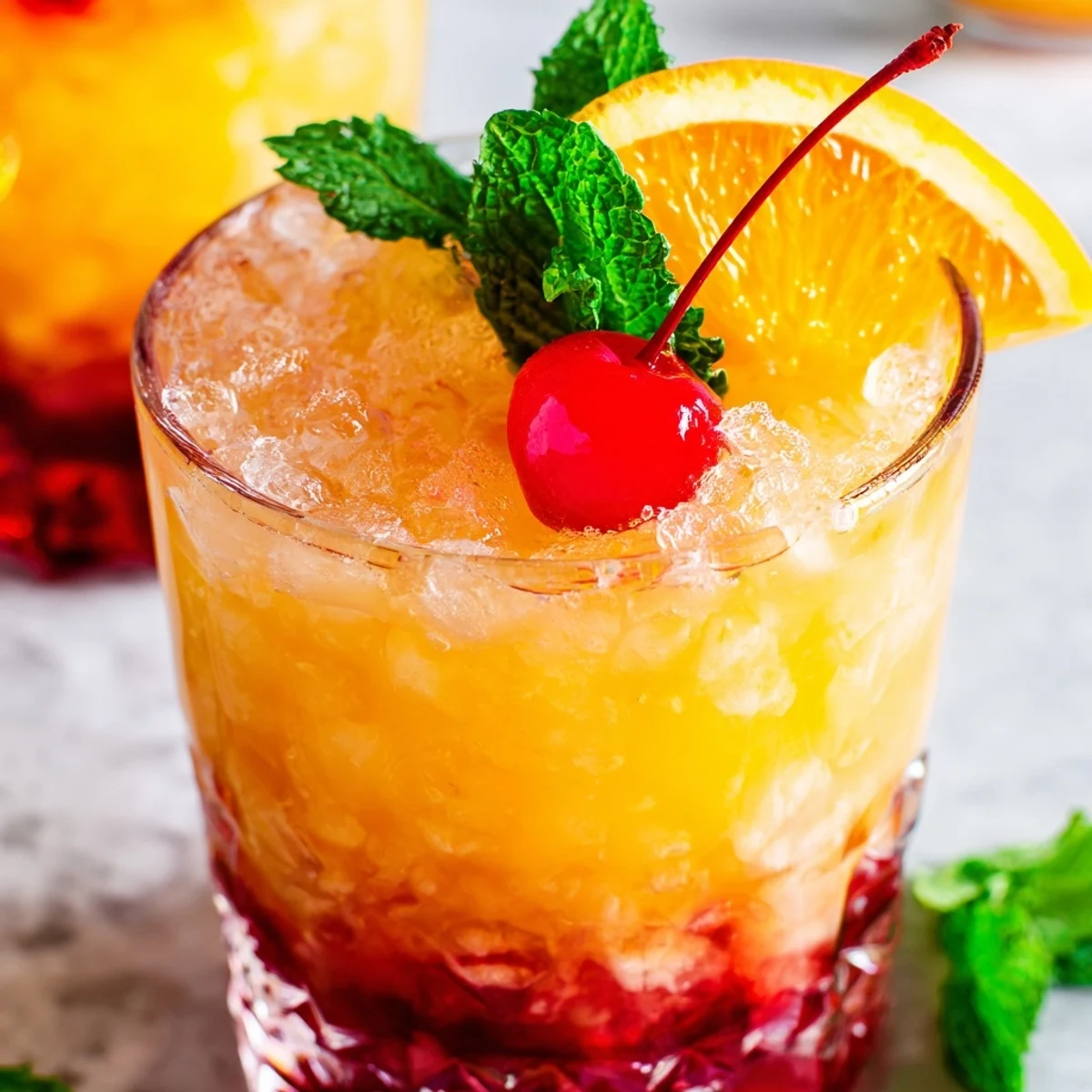 - Garnish each drink with an orange slice, a bright red maraschino cherry, and a fresh sprig of mint