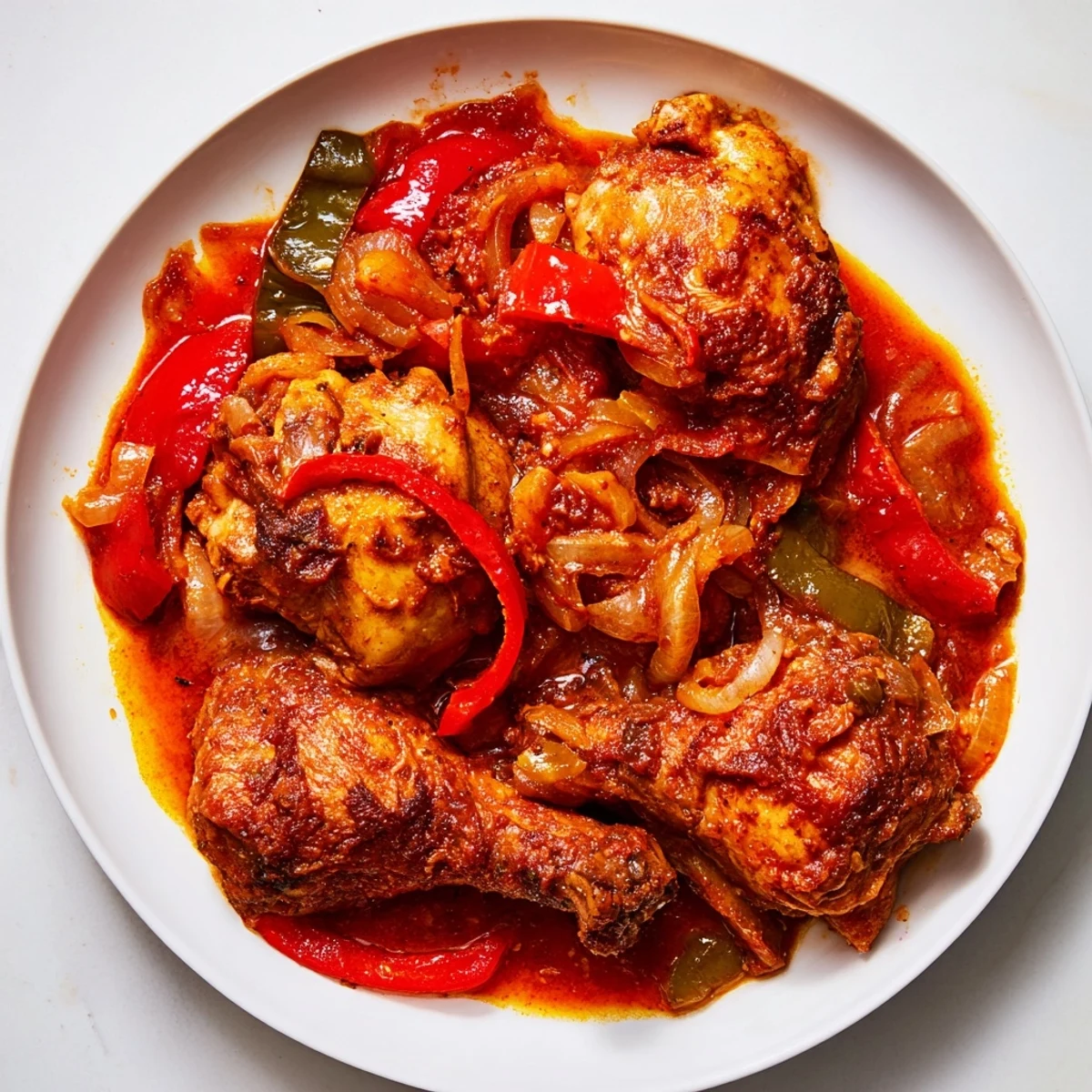 This vibrant Senegalese-inspired dish features succulent chicken thighs marinated in lemon, garlic, and ginger, then slowly simmered in a rich tomato-based sauce. The combination of onions, bell peppers, dried thyme, and paprika creates layers of aromatic flavor that develop beautifully during cooking.