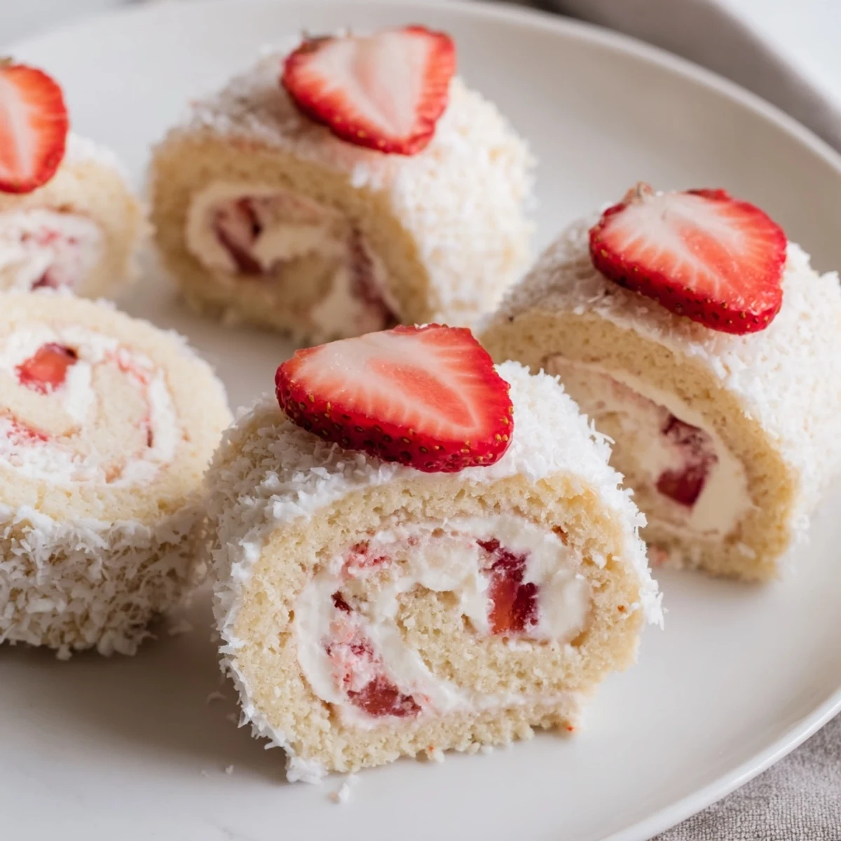 Create a charming dessert that mimics sushi presentation with classic strawberry shortcake flavors. A tender sponge cake serves as the wrapper, filled with lightly sweetened whipped cream and fresh diced strawberries. Roll, slice, and garnish with coconut for an effect resembling sushi rice. The result is an impressive yet simple fusion dessert that's perfect for gatherings, afternoon tea, or whenever you want something playful and delicious.