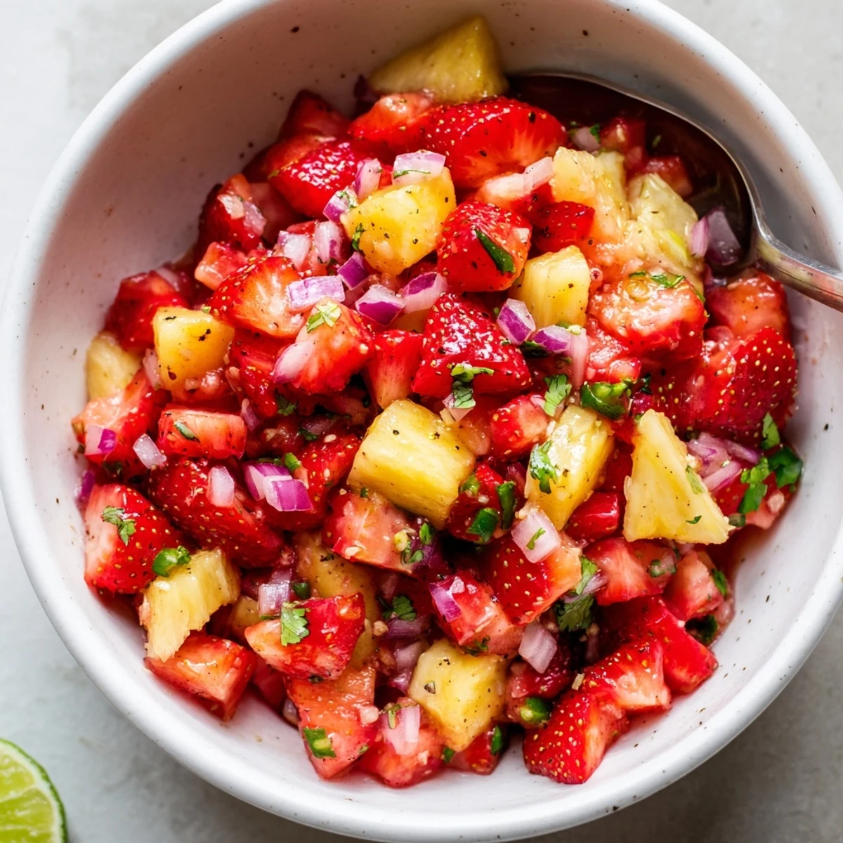 Bright, no-cook fruit salsa of diced strawberries and pineapple mixed with red onion, minced jalapeño, chopped cilantro and fresh lime. Ready in about 15 minutes, it balances ripe sweetness with zesty citrus and a touch of heat; chilling briefly deepens the flavors. Serve with chips, spoon over grilled fish or chicken, tuck into tacos, or use as a salad topping. For a milder profile swap jalapeño for a pinch of smoked paprika or omit it entirely.